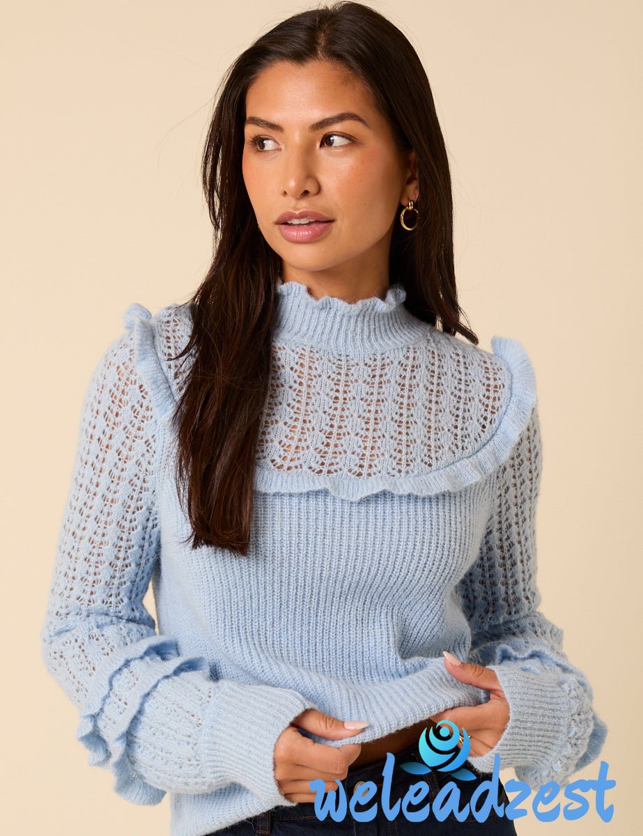 Light Blue Ruffle Pointelle Knitted Jumper